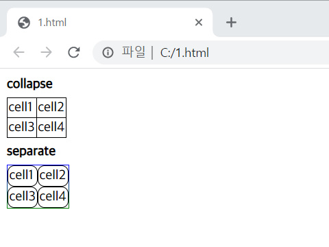 테이블에서 셀 사이의 간격을 제거하기 위해 자주 사용되는 옵션으로는 border-collapse 속성의 collapse(상쇄), separate(분리) 가 있다.