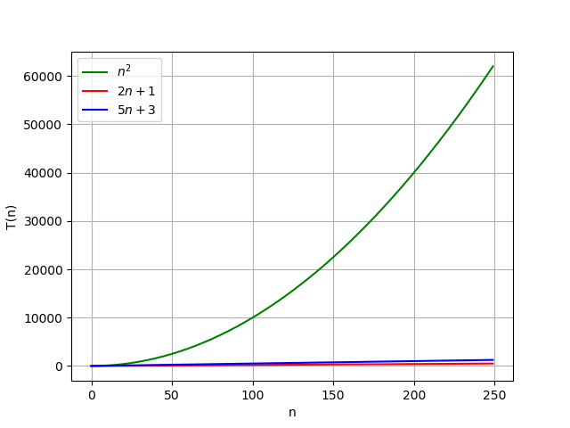 모든 연산을 정리하였을 때 대입, 덧셈, 비교연산을 모두 합쳐 시간 복잡도 함수는 T(n) = 5n + 3 이 나온다.