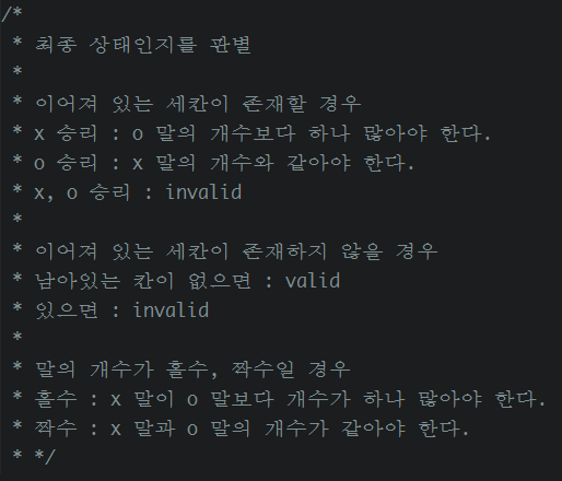 반드시 첫 번째 사람이 X를 놓고 두 번째 사람이 O를 놓아야 한다는 조건을 염두에 두고, 가능한 모든 상태를 정리한 후 구현하여 풀이했다.