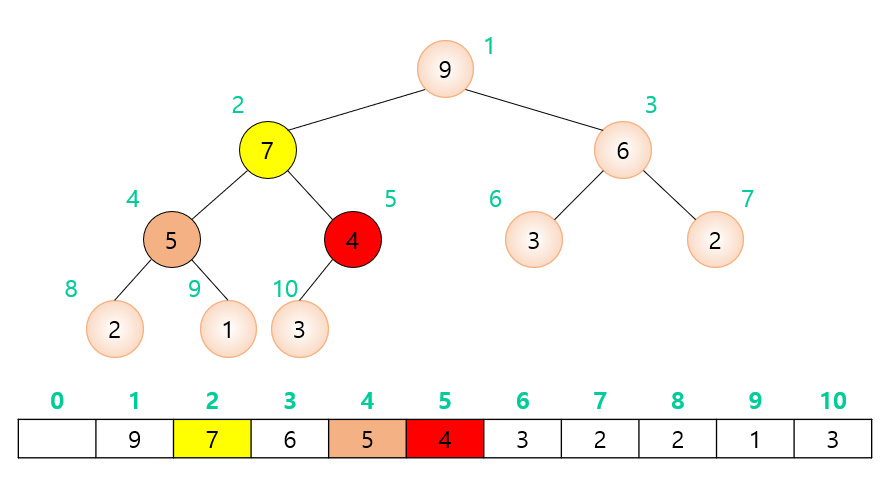 - 오른쪽 자식의 인덱스 = (부모의 인덱스) * 2 + 1