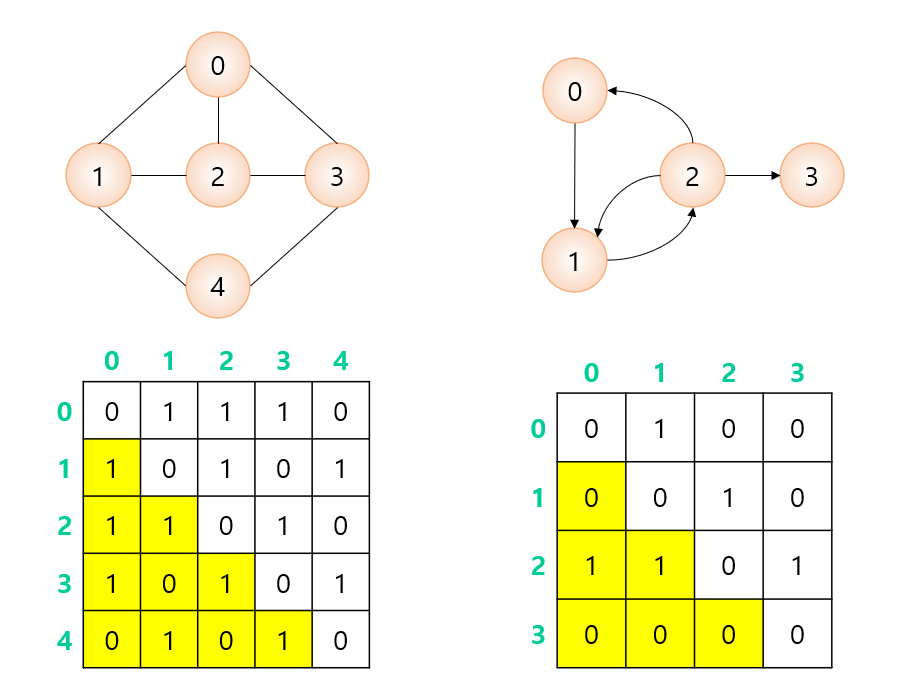 간선의 존재 여부는 M[row][col] 의 값을 조사하여 O(1) 시간 안에 즉시 알아낼 수 있다.
